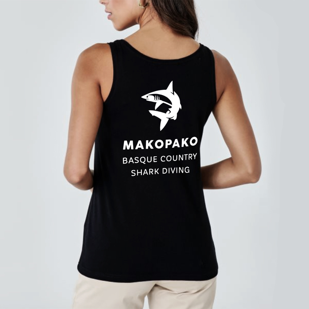 Camiseta tirantes para chica, color negro serigrafiada en el pecho y espalda en blanco. Precio 20€. (ultima unidad XL)