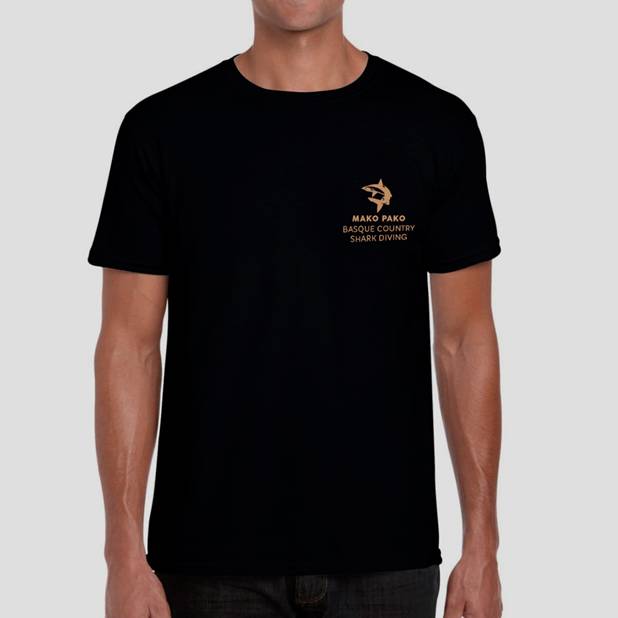 Modelo de la temporada 2025. Camiseta negra con logo en el pecho e ilustración realista de tiburón azul y marrajo a color en la espalda. Edición limitada 25 unidades Disponible en tallas S, M, L y XL. Precio 20 €.